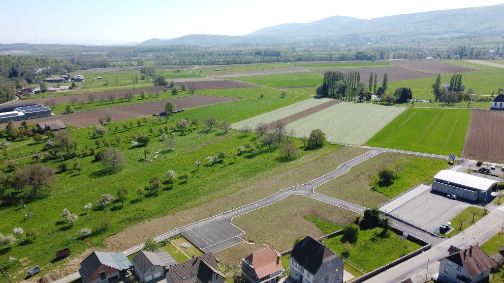 RAEDERSDORF (68 480), en périphérie de village, côté prés et vergers, avec voirie en sens unique et en partie en impasse, terrains pour maisons individuelles de 434 m² à 940 m² (dont une partie non constructible).